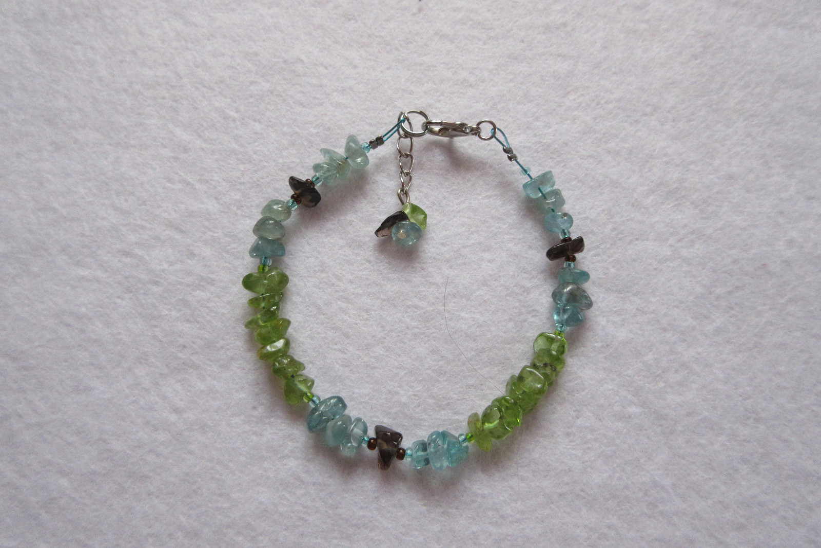 Náramek - délka 18,5 - 20,5 cm, který jsem vytvořila ze sekaného olivínu, apatitu a záhnědy. Skleněný rokajl hnědý, olivínový a světle tyrkysový průhledný. Zapínání je klasická karabinka vel. 12 mm a dvojitý protikroužek, i ostatni komponenty mají barvu platiny.